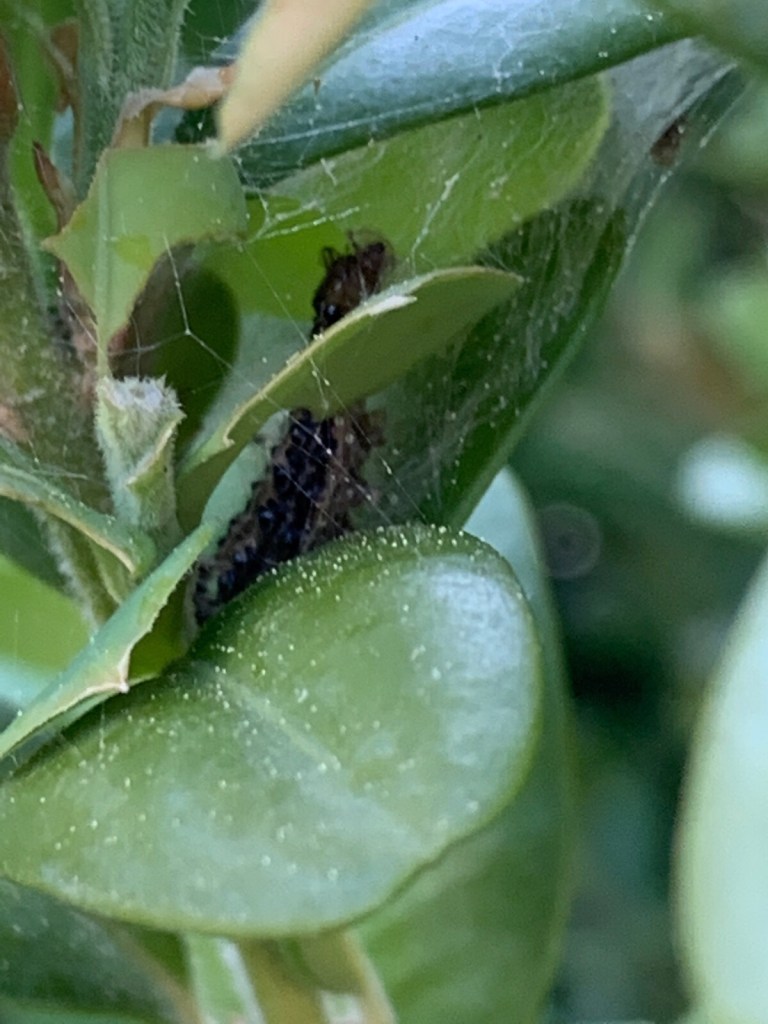 La pyrale du buis est une chenille qui, comme son nom l’indique, dévore les jeunes feuilles des buis. Je vous conseille de faire un traitement tout de suite car les miens sont déjà bien attaqués. Pour les parents, vous pouvez occuper vos enfants, qui ont des bons yeux, en repérant les chenilles et, comme ça, vous pourrez couper la branche sur laquelle est la chenille et l’écraser.